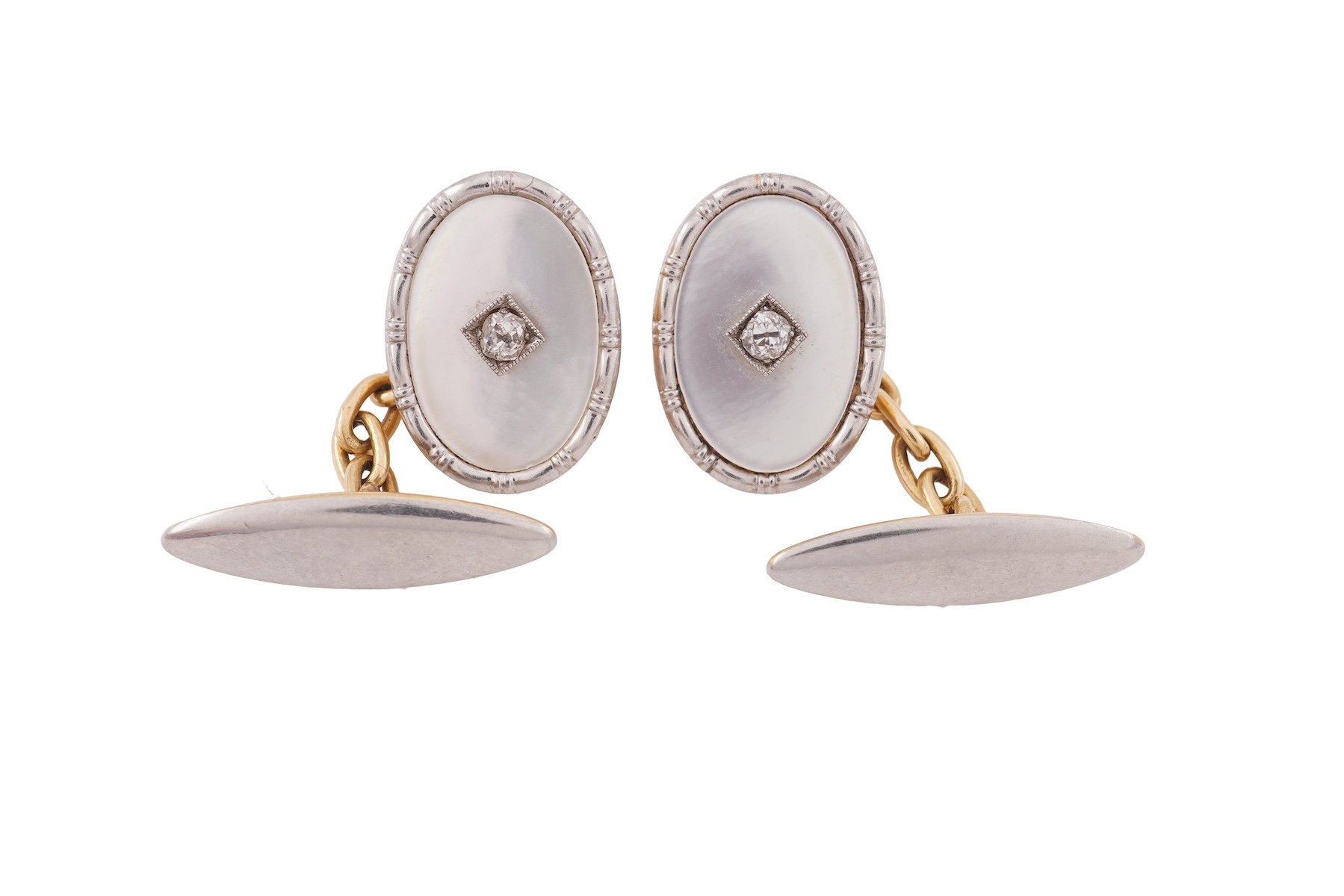 A pair of mother of pearl and diamond cufflinks, early 20th century, the fronts of oval outline, set with panels of mother-of-pearl, each centring on a cushion-shaped diamond weighing approximately 0.07 carats, to chain connectors and navette-shaped backs, mounted in bicoloured gold, fronts 1.6cm each, stamped 18ct, combined gross weight approximately 5.5 grams
