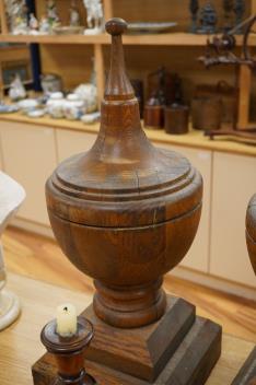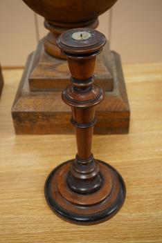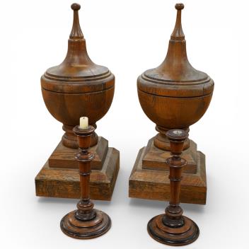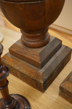 Lot 282 , A pair of oak finials and a pair of turned walnut and part-ebonised candlesticks, finials 63cm.