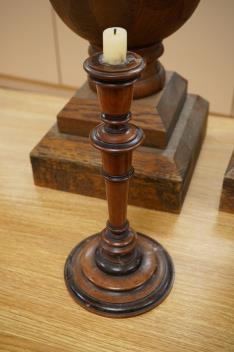 A pair of oak finials and a pair of turned walnut and part-ebonised candlesticks, finials 63cm.
