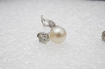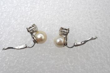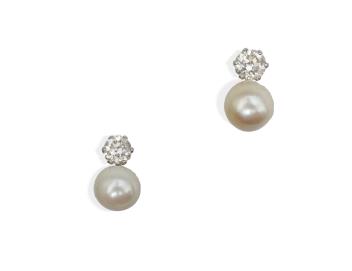 Pearls untested, well-matched, good lustre, backs not possible to inspect due to setting, minor imperfections to nacre. Diamond bright and lively, nice pair of antique circular cuts, estimated colour approximately I/J, SI1 and VS clarity respectively. Metal unmarked and untested, either white gold or platinum - not base metal.