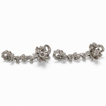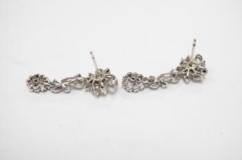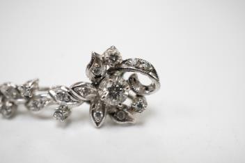 Lot 915 , A pair of recent white metal and diamond cluster set drop earrings, of foliate design with pear shaped drops, overall 29mm.