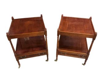 A pair of reproduction George III style yew two tier lamp tables, width 46cm, depth 46cm, height 63cm