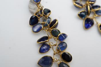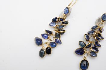 A pair of sapphire pendent earrings, each of tassel design, set with oval sapphires in spectacle settings, length 4.4cm each, hook fittings
