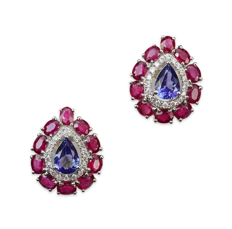 A pair of tanzanite, ruby and diamond earrings, each of pear-shaped outline, centring on a pear-shaped tanzanite within a border of brilliant-cut diamonds and oval rubies, mounted in white gold, length 1.8cm each, clip and post fittings