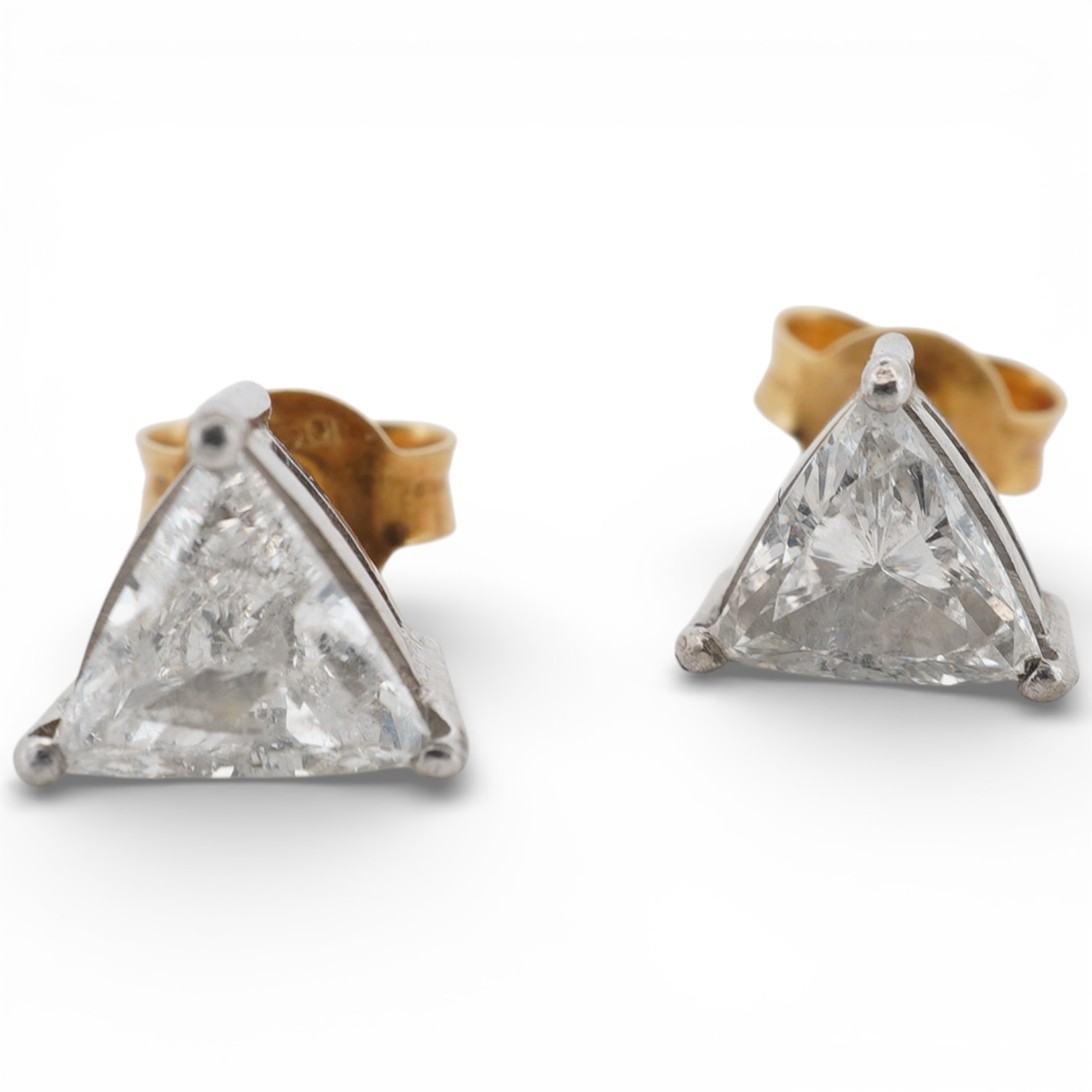 Lot 1157 , A pair of triangular cut diamond ear studs, each weighing approximately 0.60 - 0.70 carats, mounted in gold, length 0.7cm each, post fittings, combined gross weight approximately 2.5 grams