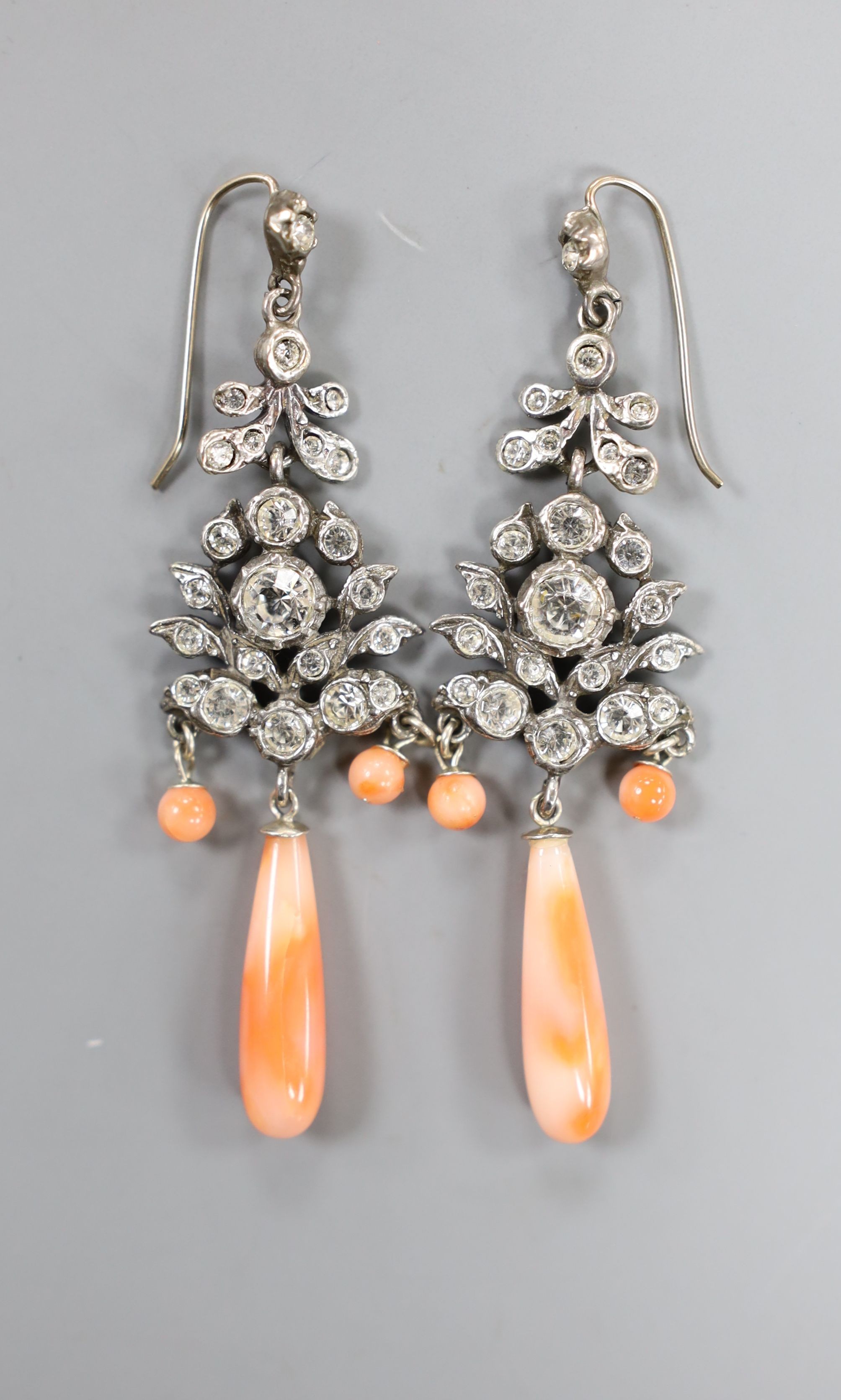 A pair of white metal, white paste and coral set drop earrings, 67mm.