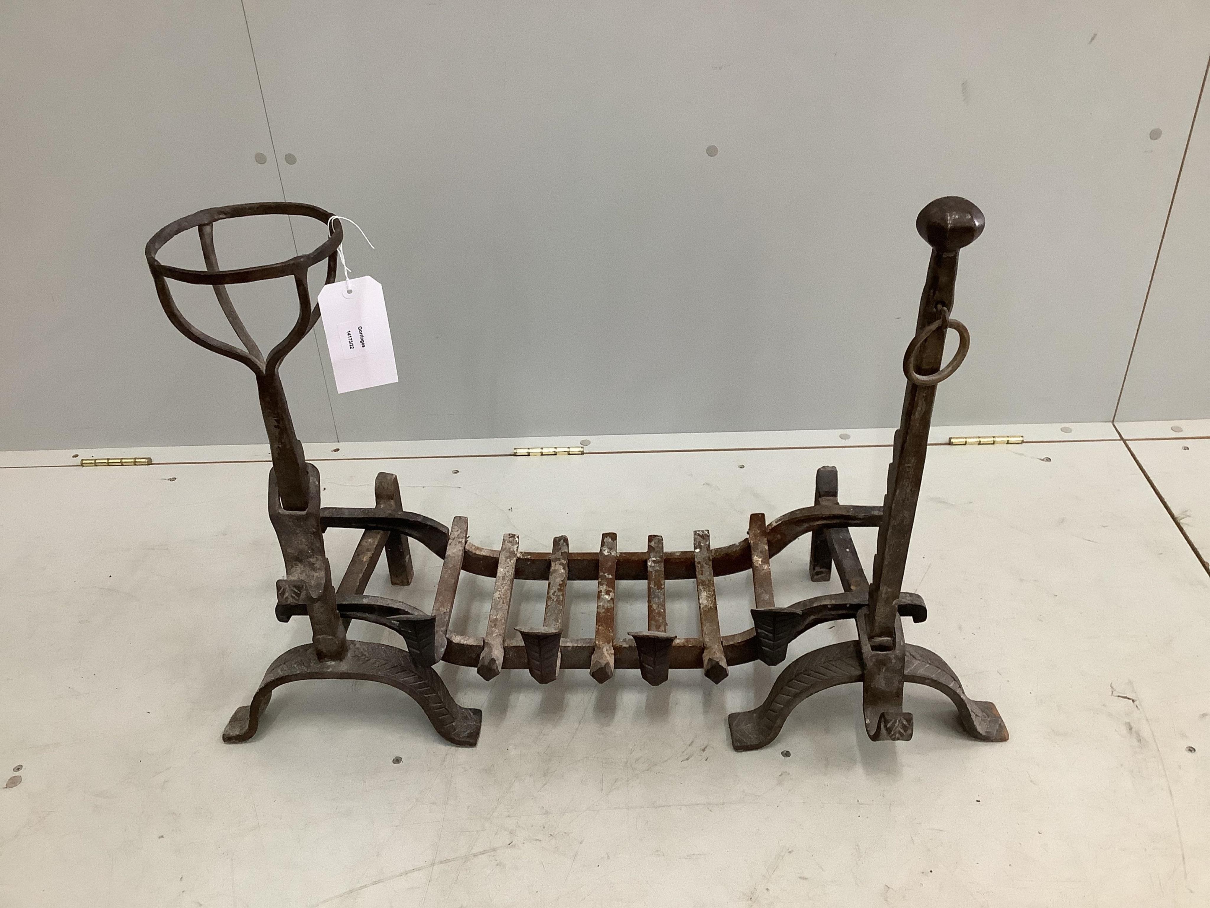 A pair of wrought iron fire dogs and grate, width 82cm, depth 36cm, height 62cm. Condition - good