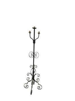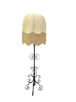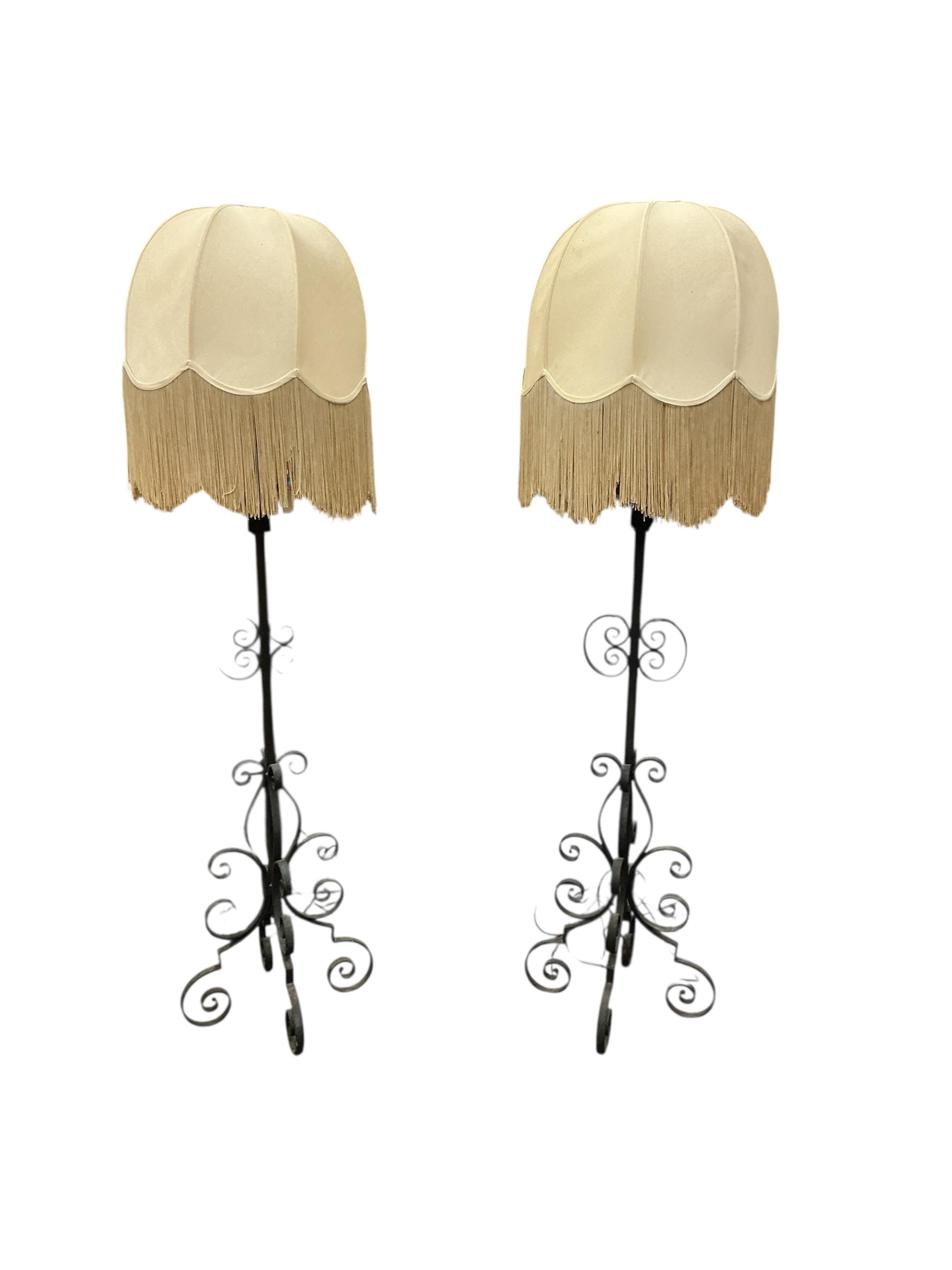 Lot 1025 , A pair of wrought iron standard lamps, handmade by the blacksmith at Offham, with shades, width 22cm, depth 32cm, height to top of shade 169cm