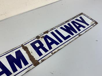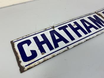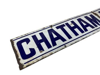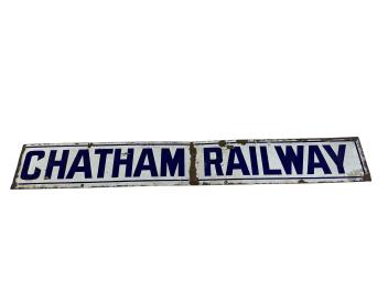 A part section of a South Eastern & Chatham Railway enamel sign; CHATHAM RAILWAY, dark blue lettering on white ground