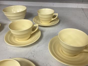 Lot 1390 , A part-set of Keith Murray Wedgwood teaware in matt straw, five cups and saucers, milk jug, sugar bowl and a spare saucer