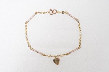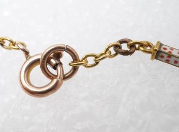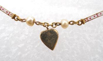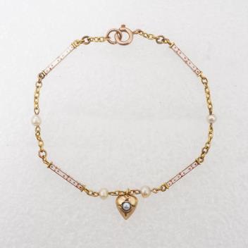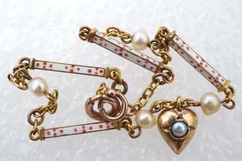 A pearl and enamel bracelet, late 19th century, the bracelet composed of baton-shaped link applied with white enamel with red dots, connected by sections of chain linking threaded with pearls, centring on a heart-shaped pendant set with a half pearl, mounted in gold, length 20cm, gross weight approximately 5.5 grams, pearls untested