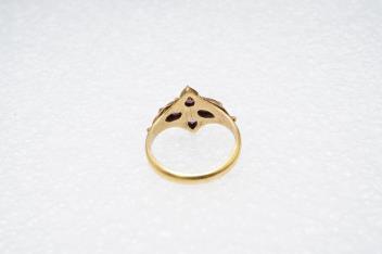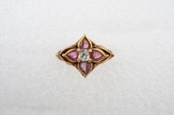 A pink tourmaline and diamond ring, circa 1988, of Gothic inspiration, designed as a quatrefoil of pear-shaped pink tourmalines around a cushion-shaped diamond weighing approximately 0.15 carats, mounted in 22ct gold, size R1/2, British hallmarks, gross weight approximately 7.5 grams
