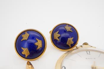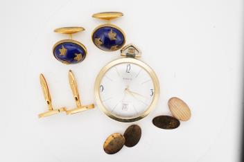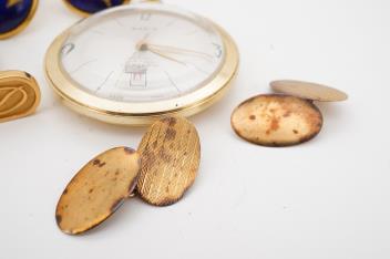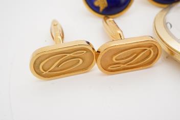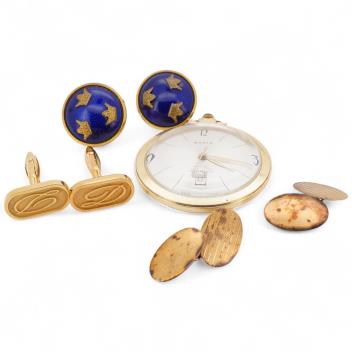 Lot 2935 , A pocket watch and three pairs of cufflinks, comprising: one pair of oval 9ct gold cufflinks, each end 18 x 12mm, British hallmarks, gross weight approximately 3 grams; together with a pair of gilt metal cufflinks by Dup