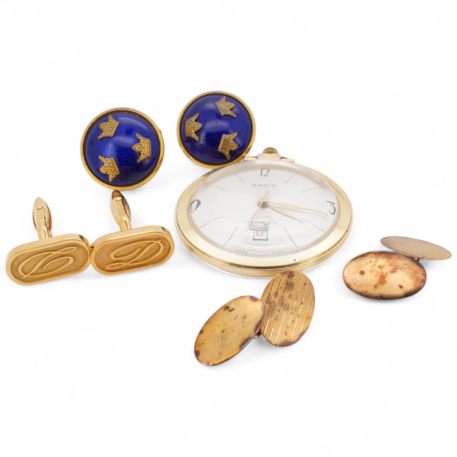 A pocket watch and three pairs of cufflinks, comprising: one pair of oval 9ct gold cufflinks, each end 18 x 12mm, British hallmarks, gross weight approximately 3 grams; together with a pair of gilt metal cufflinks by Dupont; a pair of gilt metal cufflinks applied with blue enamel with a design of crowns; and a mid-century open-faced gilt metal pocket watch by Basis, length 5.3cm including suspension hoop