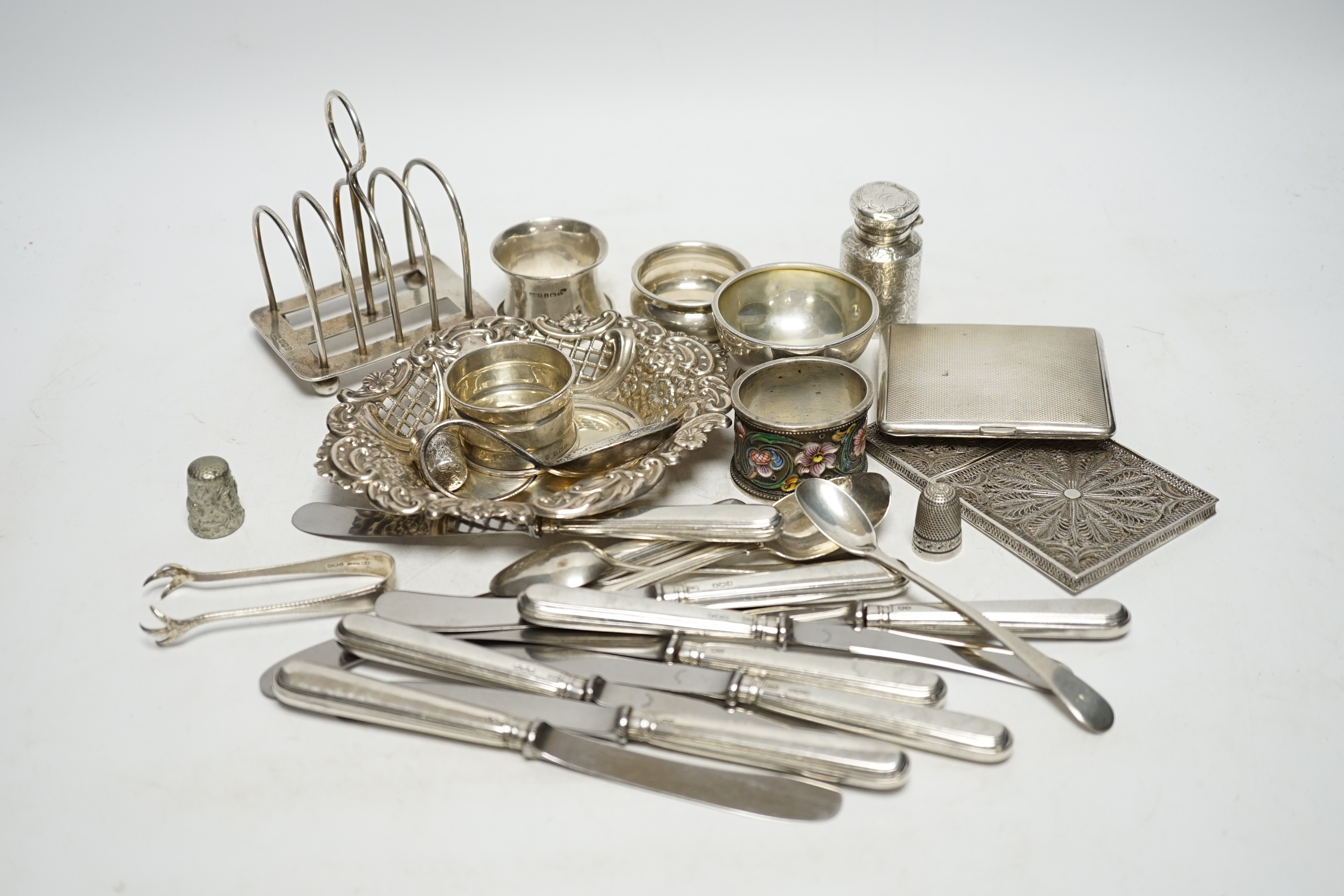 A quantity of assorted silver ad white metal items including a Russian 84 zolotnik and cloisonné enamel napkin ring, bon bon dish, scent bottle, cutlery, toast rack, cigarette case etc. Condition - fair to poor