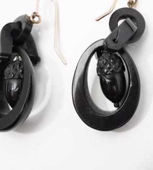 A rare pair of Victorian jet earrings, circa 1870, each composed of a carved jet links, suspending an acorn pendant within a drop-shaped frame, length 5.6cm, hook fittings