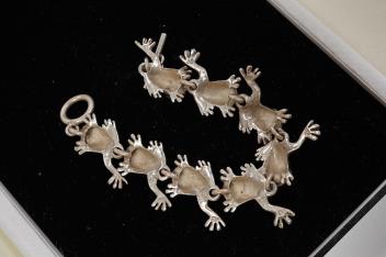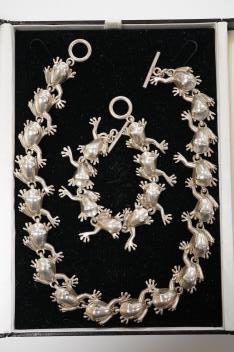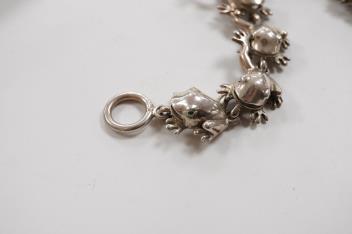 Lot 1913 , A recent white metal frog necklace, overall length 42cm and matching bracelet, 19cm, both stamped 925, gross 153 grams.