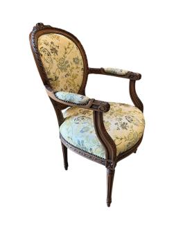 A reproduction Louis XVI style carved beech upholstered open armchair, width 65cm, depth 54cm, height 94cm