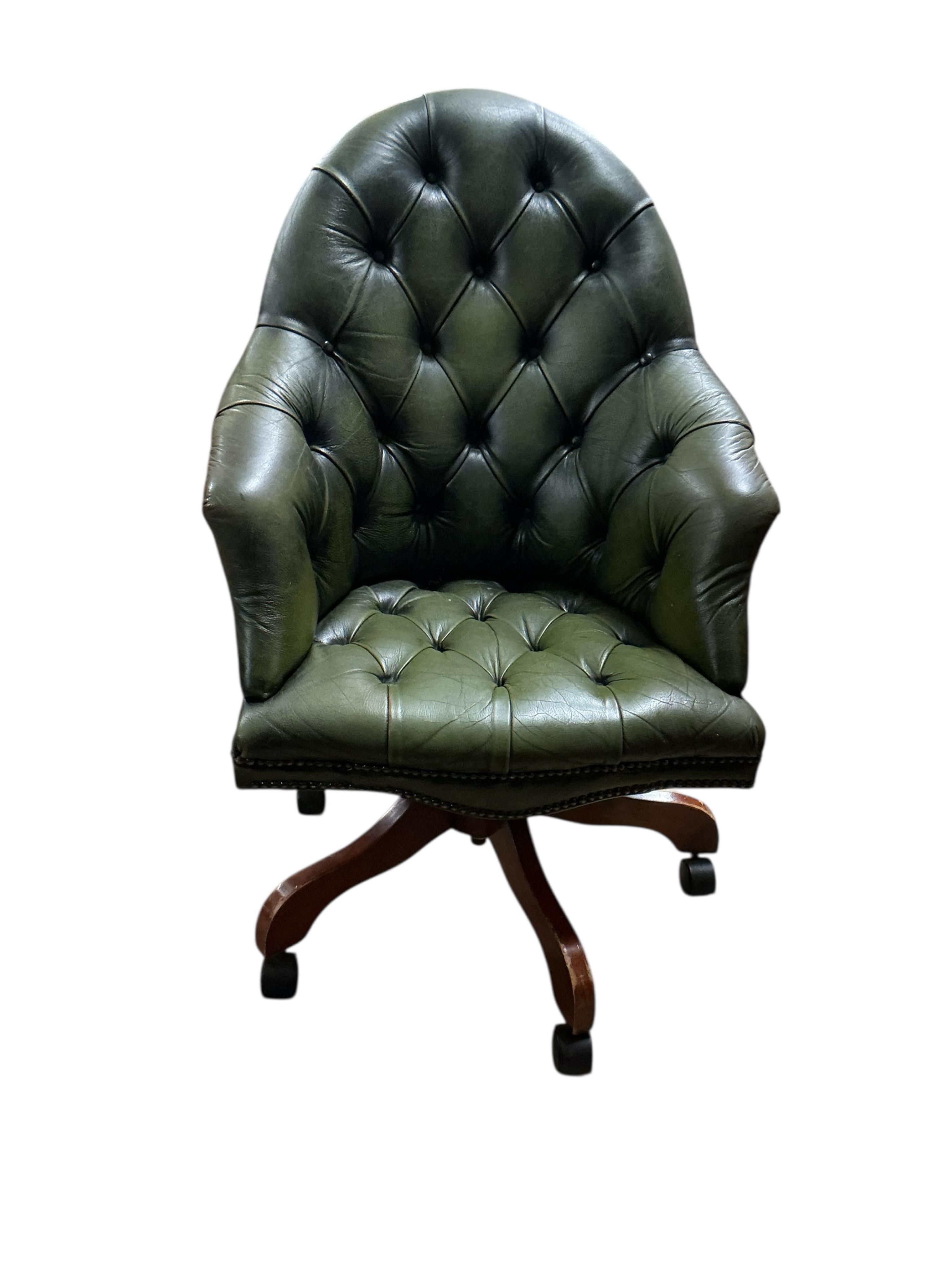 Lot 202 , A reproduction buttoned green leather swivel desk chair, width 66cm, depth 70cm, height 100cm