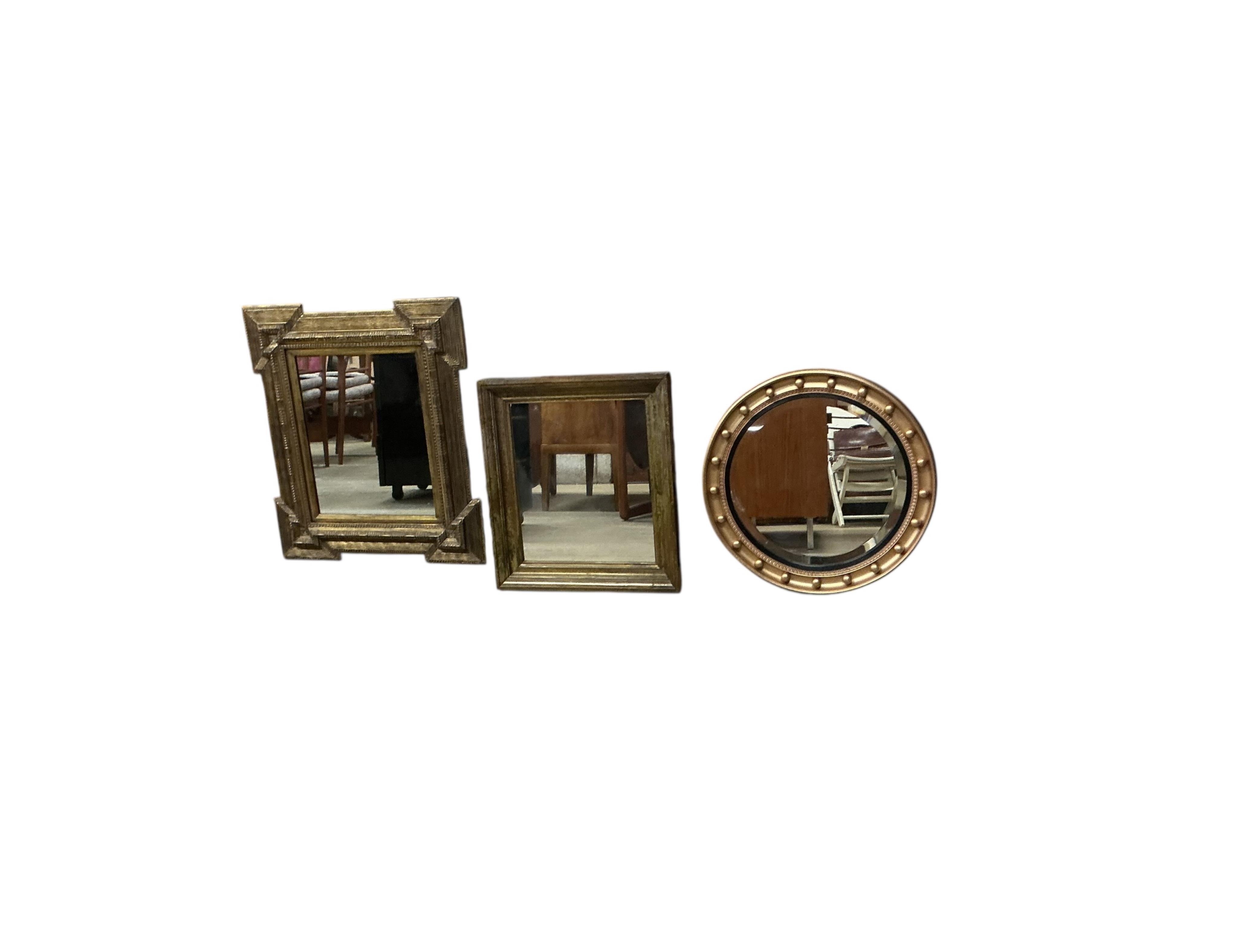 A reproduction rectangular ripple moulded wall mirror width 69cm height 80cm, a Regency style circular bevelled wall mirror and one other mirror (3)
