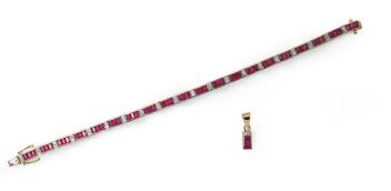 A ruby and diamond bracelet and pendant, comprising: a bracelet, composed of articulated links channel-set with calibré-cut rubies, spaced by links set with pairs of brilliant-cut diamonds, mounted in bicoloured gold, length 17.5cm, stamped 750; and a pendant of similar design, length 1.8cm including bail