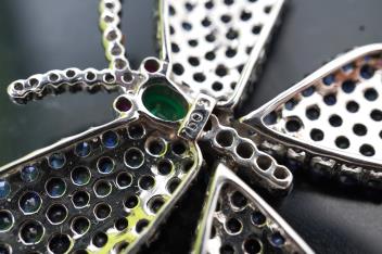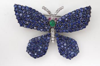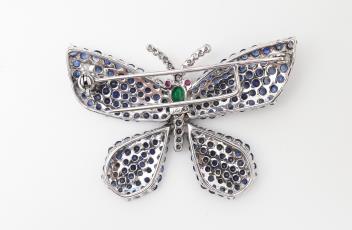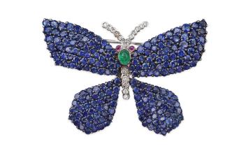 A sapphire, emerald, ruby and diamond brooch, designed as a butterfly, its wings pavé-set with circular-cut diamonds, its body set with brilliant-cut diamonds, its thorax and eyes set with a cabochon and rubies respectively, mounted in white gold, wingspan 4.6cm, stamped 750, gross weight approximately 13 grams