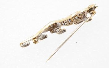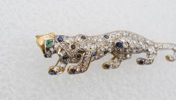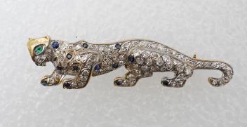A sapphire, emerald and diamond brooch, circa 1988, modelled as a panther, its body set with single-cut diamonds totalling approximately 2.00 carats, circular-cut sapphires and an emerald eye, mounted in 18ct gold, length 5.8cm, British hallmarks, gross weight approximately 10 grams