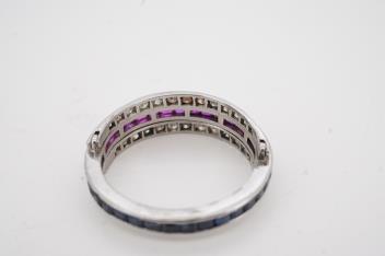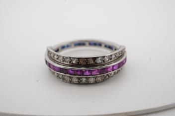 Lot 1163 , A sapphire, ruby and diamond 'Day and Night' ring, mid 20th century, designed as a continuous band channel-set with calibré-cut sapphires and rubies, between hinged half-hoops set with circular-cut diamonds totalling app