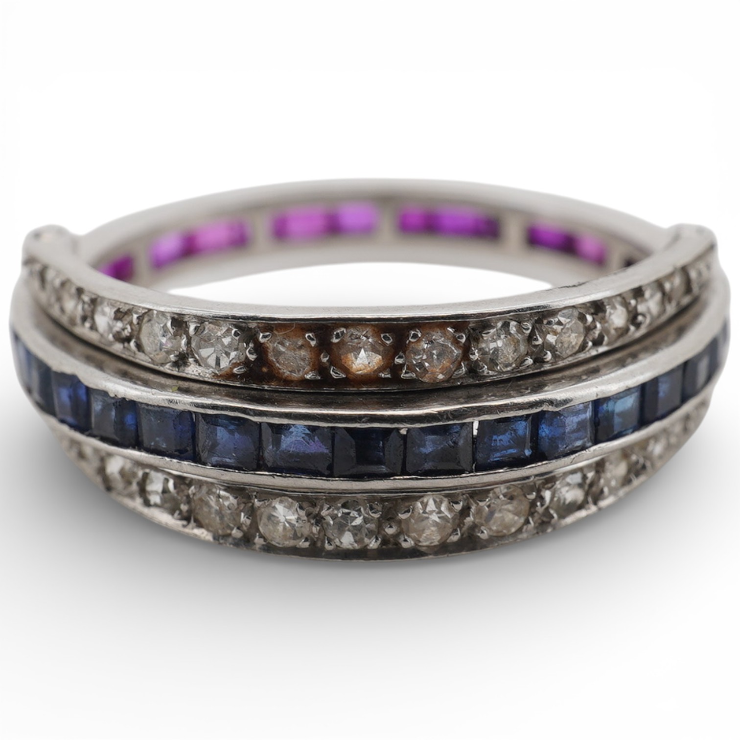 A sapphire, ruby and diamond 'Day and Night' ring, mid 20th century, designed as a continuous band channel-set with calibré-cut sapphires and rubies, between hinged half-hoops set with circular-cut diamonds totalling approximately 0.40 carats, mounted in platinum, size P, gross weight approximately 4 grams