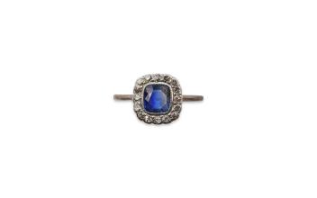 A sapphire and diamond cluster ring, early 20th century, collet-set with a cushion-shaped sapphire within a border of single-cut diamonds, mounted in gold and platinum, size N1/2