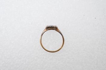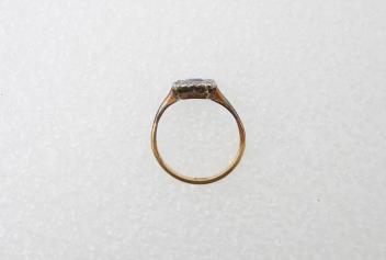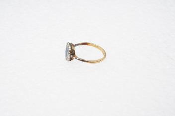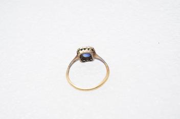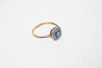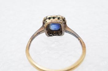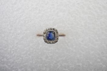 Sapphire attractive, well-saturated blue, measuring approx 5.5 x 5 x 2.8mm, some zoning. Diamonds bright and lively. Gross weight approximately 2.5 grams.