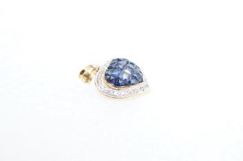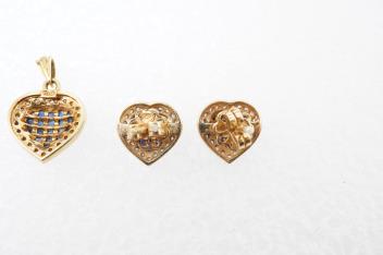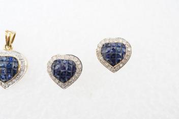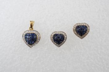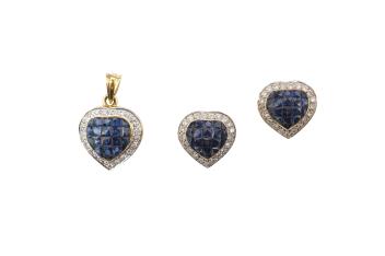A sapphire and diamond demi-parure, comprising: a pendant and a pair of earrings, each of heart-shaped outline, centring on a bombé arrangement of invisibly-set calibré-cut sapphires, within borders of brilliant-cut diamonds, mounted in gold, pendant length 2.2cm, stamped 750, earrings 1.2cm each, post fittings, screw fittings stamped 750