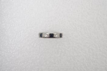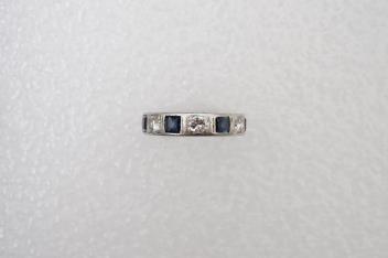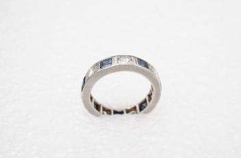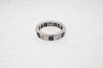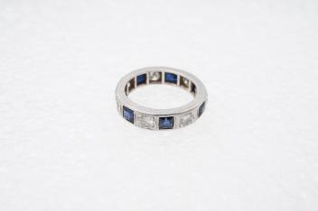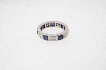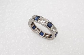 A sapphire and diamond eternity ring, designed as a continuous band of brilliant-cut diamonds totalling approximately 1.00 carat, spaced by square step-cut sapphires, size L