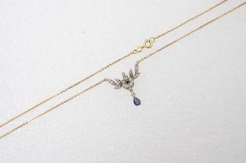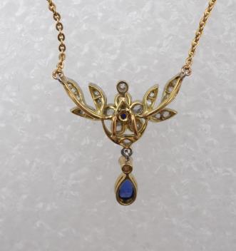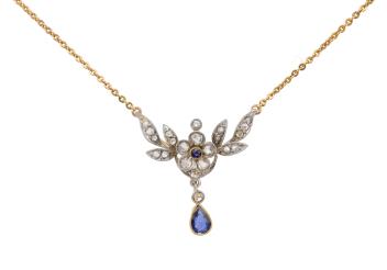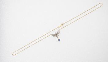 A sapphire and diamond pendant, designed as a flower, set with rose-cut diamonds and a circular-cut sapphire, suspending a pear-shaped sapphire drop, mounted in gold and platinum with millegrain borders, to a gold chain necklace, pendant length 2.2cm, chain length 44cm, stamped 0750, gross weight approximately 4.5 grams