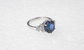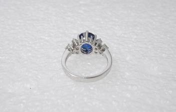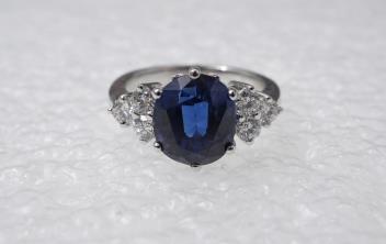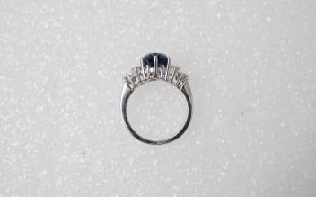 Very attractive sapphire, good colour and clarity, measuring 9.4 x 8.2 x 6.1mm. Chip to pavillion on one side - not particularly severe or noticeable, does not really impact the shape of the stone. Mounted in white gold or platinum, but unmarked so not possible to determine which. Overall in good condition, gross weight approximately 5 grams.