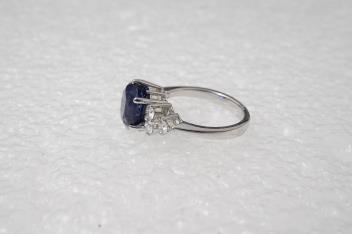 A sapphire and diamond ring, claw-set with an oval sapphire weighing 4.39 carats, to shoulders set with trios of brilliant-cut diamonds totalling approximately 0.40 carats, size L1/2