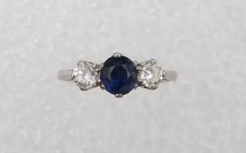 A sapphire and diamond ring, Claw-set with a circular-cut sapphire weighing approximately 1.00 carat, between shoulders set with brilliant-cut diamonds totalling approximately 0.50 carats, mounted in platinum, size P1/2, stamped PLAT, maker's mark, gross weight approximately 4 grams