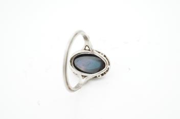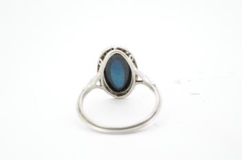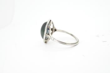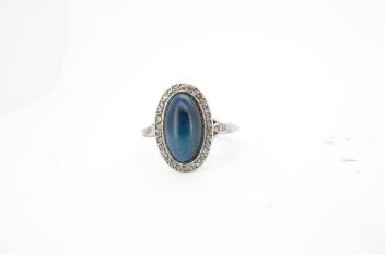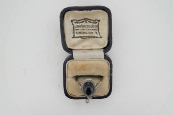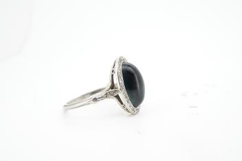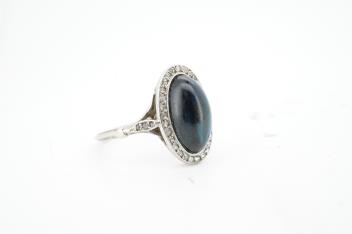Lot 927 , A sapphire and diamond ring, 1920s, set with a cabochon sapphire measuring approximately 2.4 x 6.8 x 4.7mm, within a border of rose-cut diamonds, mounted in platinum, size L1/2