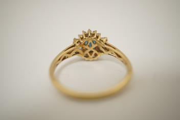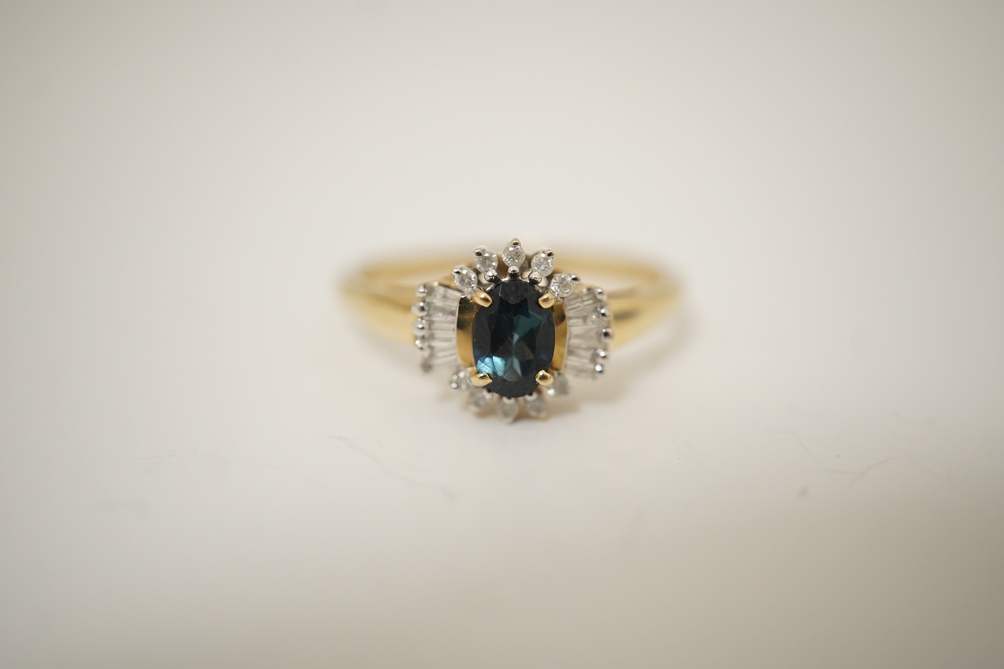 A sapphire and diamond ring, set with an oval sapphire, bordered by brilliant-cut and tapered baguette diamonds totalling approximately 0.15 carats, mounted in 14ct gold, size O, British hallmarks, gross weight approximately 2.4 grams