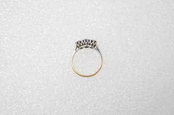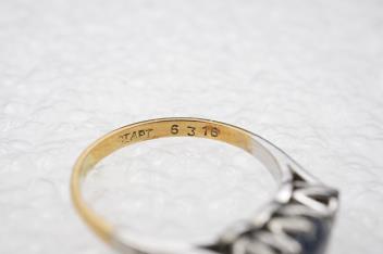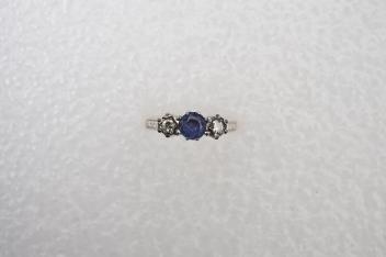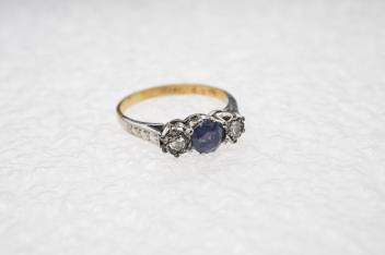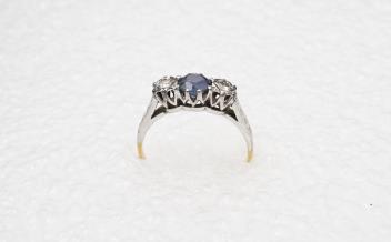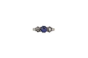 Lot 2919 , A sapphire and diamond three-stone ring, claw-set with a circular-cut sapphire measuring approximately 4.9 x 4.9 x 3.1mm, between single-cut diamonds totalling approximately 0.15 carats, mounted in gold and platinum, siz