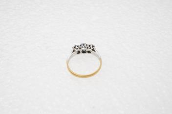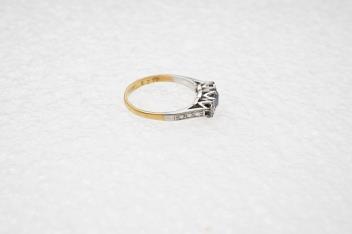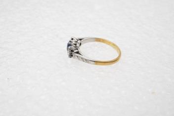 A sapphire and diamond three-stone ring, claw-set with a circular-cut sapphire measuring approximately 4.9 x 4.9 x 3.1mm, between single-cut diamonds totalling approximately 0.15 carats, mounted in gold and platinum, size L, numbered 6318, gross weight approximately 3 grams