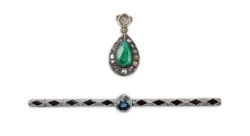 A sapphire bar brooch and an enamel and diamond pendant, early 20th century, the pendant centring on a pear-shaped panel of green guilloché enamel within a border of rose-cut diamonds, suspended from a rose-cut diamond surmount, mounted in silver and gold, length 1.8cm; the bar brooch set to the centre with a circular-cut sapphire, flanked by geometric sequences of calibré-cut onyx and rose-cut diamonds, mounted in gold and platinum, length 5.5cm, combined gross weight 5 grams