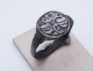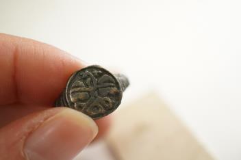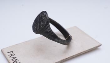 Lot 3008 , A sentimental signet ring, France, circa 16th century, the circular panel depicting two hearts tied in a true lover's knot, size R1/2, labelled 2244, Provenance: formerly in the collection of Dame Joan Evans (1893-1977)