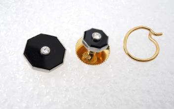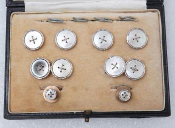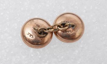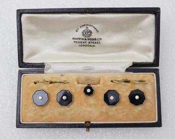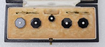 Lot 214 , A set of 9ct gentleman's dress set cufflinks and button, retailed by Tessier