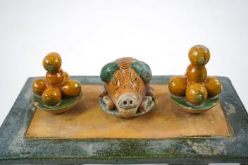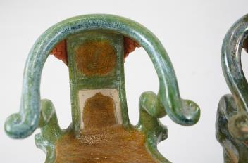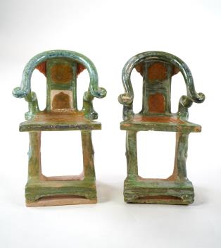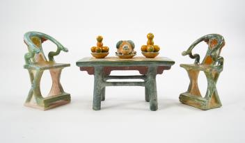 Lot 84 , A set of Chinese Ming Sancai models of table with offerings and a pair of horseshoe shaped armchairs, 16th century