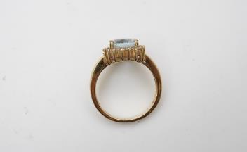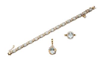 A set of aquamarine jewels, comprising: a bracelet, collet-set with oval aquamarines, spaced by crossed links accented with single-cut diamonds, mounted in gold, length 17cm, stamped 18K 750; a pear-shaped aquamarine and diamond pendant mounted in gold, length 2.9cm, stamped 750; and an aquamarine and diamond cluster ring, mounted in gold, size O, stamped 18CT, combined gross weight approximately 20 grams