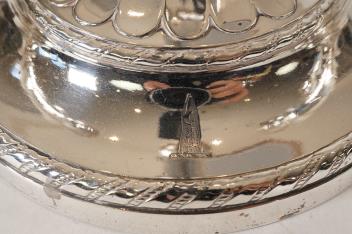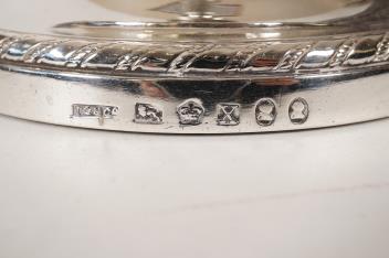 Some wear to the engraved decoration on the top and bottom collars. One sconce has three dents and one other sconce is unmarked, (possible replacement). Very minor nicks and surface scratches in places. Hallmarks clear on all pieces.