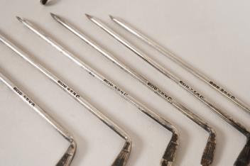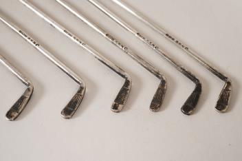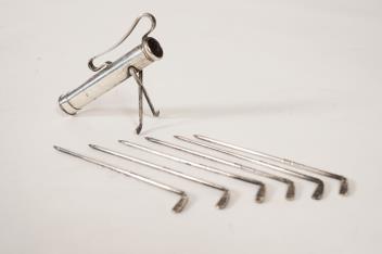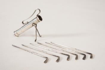 Lot 81 , A set of six George V novelty silver cocktail sticks with holder, modelled as a golf bag with clubs, by John Nowill & Sons