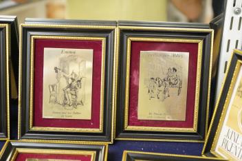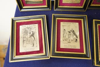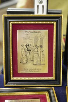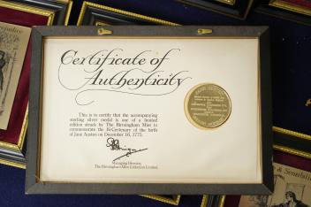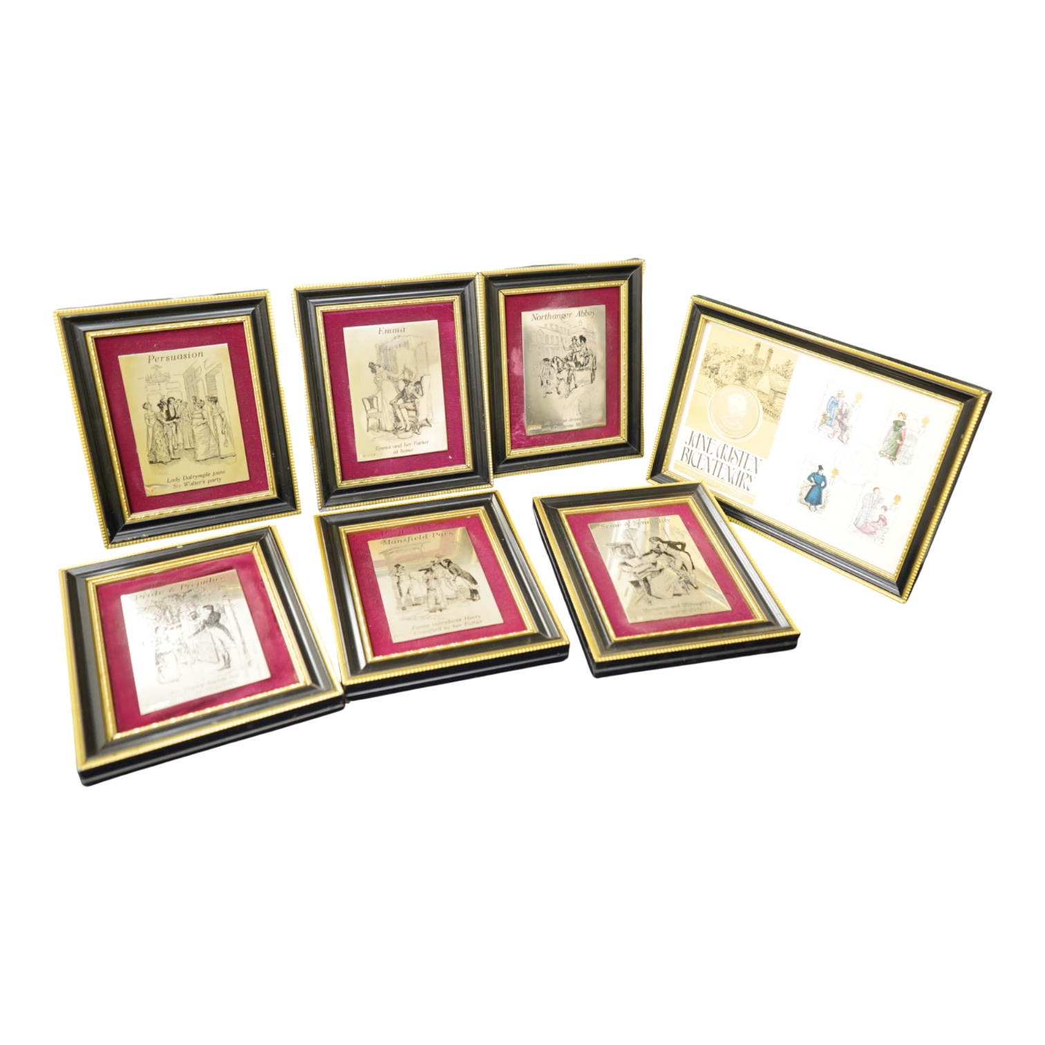 Lot 410 , A set of six Jane Austen commemorative silver plaques, purchased in 1975 for the Bicentenary of her birth, all six of her novels depicted, and a related silver-gilt medal with certificate of Authenticity, plaques 10x7cm