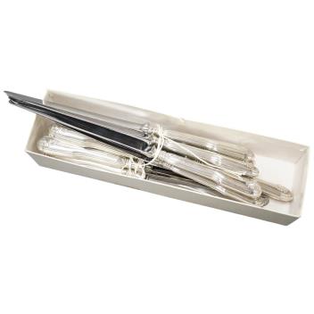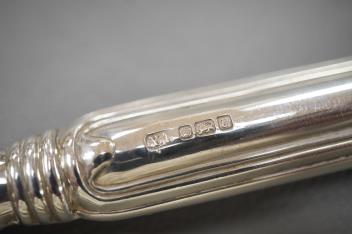 Lot 829 , A set of six modern silver fiddle, thread and shell pattern table knives and six matching dessert knives, Yates Brothers, Sheffield, 1995/96.